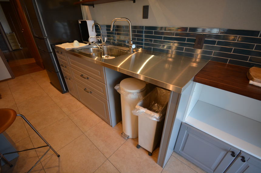 キッチンのゴミ箱が通路に出てしまうと導線が悪くなります。また、ゴミの分別の為、複数のゴミ箱が必要になるケースがあります。その為、よくお客様からゴミ箱置きスペースを作って欲しいというリクエストを頂きます。65㎝の奥行きのメトードキャビネットを使って、造作でダストボックス置き場をお作りさせて頂きました。 |
