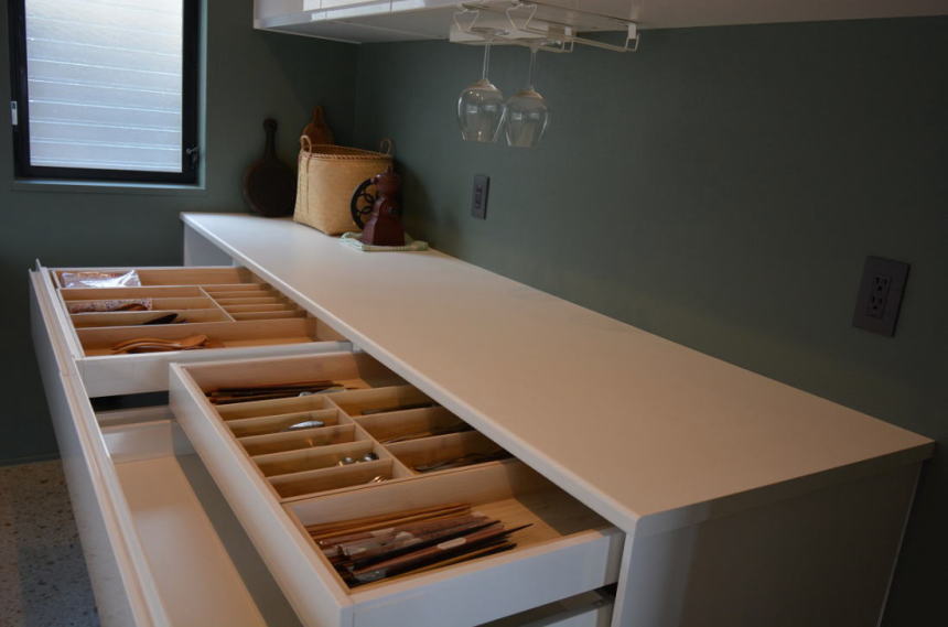 イケアキッチンには、国産のように包丁入れがありません。通常は、引き出しの中にカトラリーを入れてそこに包丁を収納します。特段のご希望があれば、扉の裏にドイツ製の包丁入れを特注でお取り付けさせて頂きます。 |