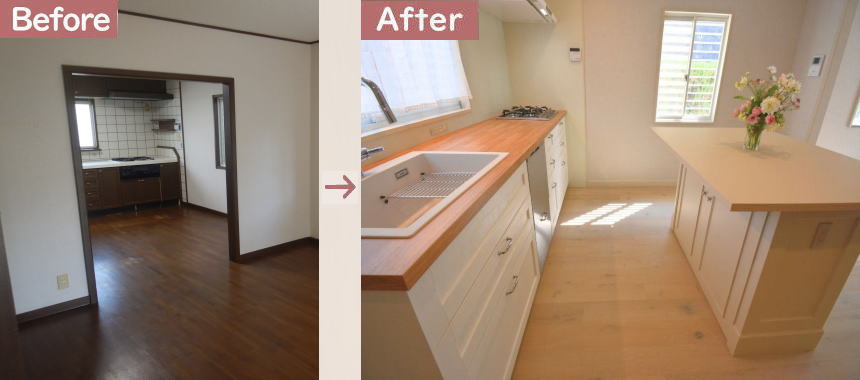 *以前はハウスメーカーの戸建のキッチンスペース。リノベーションで理想のキッチンに変身。配膳いらず、出来た料理はカウンターに並べてすぐに食べれる!食べ終わったらお皿はシンクへさっとIN!効率よく家事ができるので時短にも。お忙しい方専用にカスタマイズすれば、心強い味方に!あたなだけのMyキッチンの完成です。