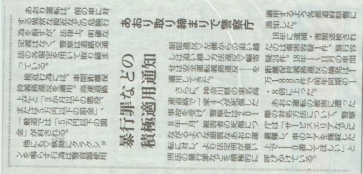 | 2019年1月25日の殺人罪適用は「堺あおり運転」で警察庁から悪質な「あおり運転」について2018年1月に各都道府県に通知されている。 あおり運転は法律上明確な定義はなく,道路交通法の各規程で摘発し,接近行為の摘発には「車間距離保持義務違反」を適用して高速道路上と一般道で罰金が異なる。 私は,車間距離保持義務違反となる1M~2Mの車間と幅寄せをされた被害を数回受け,相生署員に直接危険行為であり取締を要求したが,違反でないと退けられている。[報道された奈良県警の高速道の例を上げて説明している] 大型車の接近に対して敏感になり,避けるか加速して危険回避も自己判断している。 運転マナーでは,追突事故例に鑑み速度毎に前の車両との車間距離をキープし前車ドライバーに危機意識を持たせない工夫を常時している。 常識として,時速100km/hrの1秒間の進行距離は27.8m,50km/hrの速度の進行距離は13.9mで制動距離を鑑み車間を設定遵守することにしている。 2019年1月26日の読売新聞の記事を貼付する。 |