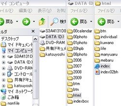 ディスクトップのマイコンをクリックし〔DATA(D)〕をクリックするとHpで作成したフォルダとファイル等が表示される。 ホームページのプログラムは03hpb。 そして、Hp Upフォルダのhtmlフォルダをクリックするとhtmlの Aサブページ(目次)『クリックする』の項目, @トップページのeindex等のファイルが 表示される。 |