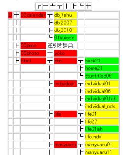 左図に示すリンクツリーの一例を示す。 hpbを起動し、リンクツリーの頁を作成し、表を作成する。 @先ず、一行×8列の表に┗ ━ ┻ ┳ ┃┣┗ ╋ をコピー。 A次に、6列×必要行の表を作成する。 B作成した一行×8列の絵記号を必要セルに張り付けてリンクの 体裁を関連付ける。 C個々人のフォルダ(赤色の背景セル)を入力。 D個々人のサブページのフォルダー名(赤色の背景セル) を入力。 E個々人のeマーク(黄色の背景セル)を入力。 F個々人のボタン・写真(緑色の背景セル)を入力。 G個々人のフォルダ・ボタン・写真データが多数蓄積していくと A4サイズで1ページに収めきれないので、中間フォルダー名を スキップして表示すると簡素で見やすいリンクツリーになる。 しかし、マイコンで整列させた内容を忠実にツーリーに表現す ると、自分以外の人にも個人データを理解してもらうことが可能 となる。 |