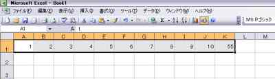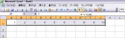 セルA1〜J1に数値1〜10を入力して足し算をする(方法−1) オートSUMを使用する |
