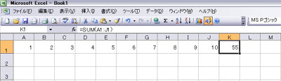 K1セルにカーソルを当てるとfxの窓に計算式が表示される この場合の計算式は 『=SUM(A1:J1)』で『』内が計算式である。 |