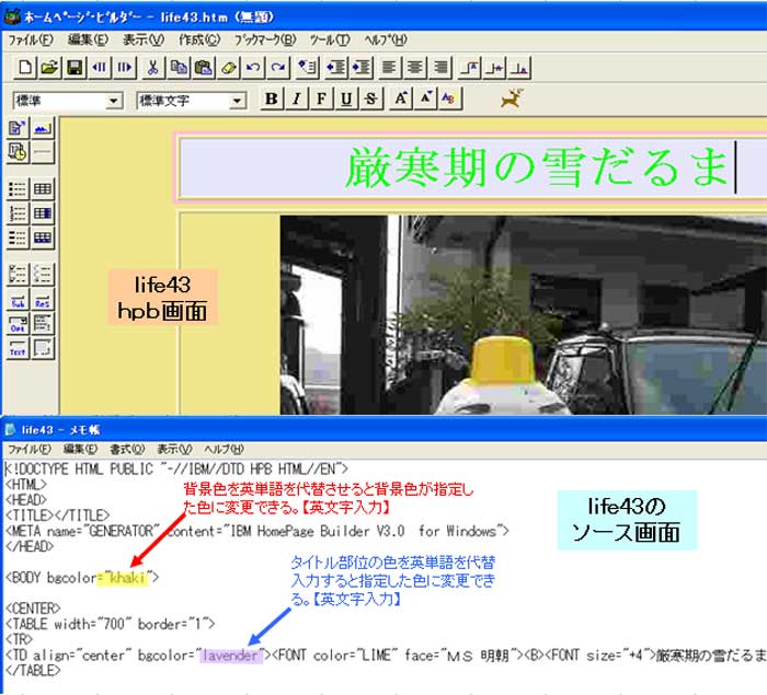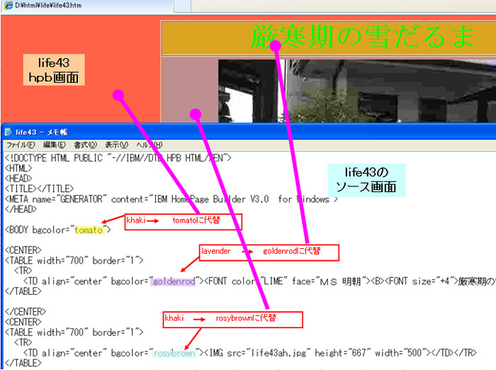 下段はメモ帳の注記のごとく”bgcolor”=”****”を代替入力し上書き保存しHpbのブラウザーを更新し指示色に変更した結果を表示している。