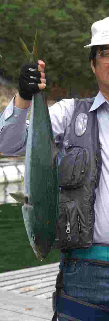 自分が調達したエサを付け投入する。 一投目だ!浮きが立たない! これは何か食っている。 ガツンとあわせる。 ググッと引き込むあたり、すぐ鯛でないことが判る。 ハリスは1.5号だ! グランドマックスと言えども相手は大物だ! 慎重にならざるを得ない。 青物が初めてかかったイカダは歓声でいっぱいだ! なんとしてもあげなくてはならない! 気を締めるが皆が浮きを追う中5分が過ぎた頃だろうか? 一人の竿が仕掛けとともに投入されたままだ! 泳がすのは無理だ!1.5号のはリスは悲鳴を上げ皆の期待とは反対に青物はイカダの底へ悠々と泳いでいった。 しばらくたって竿を曲げる人がいなくなった頃、釣堀の主人が今から”青物を!”といわず、それが期待できる様で特別のエサを数種もって来てくれた。 隣にいたM氏の竿が解凍アジのエサを投入した瞬間ウキが消え大きく弧を描く!彼は”鯛ではない”と一言! 皆一斉に竿を上げ魚とのやり取りを見守り、”バラスなゆっくり上げ”の声に従いハマチをゲット! 1.5号のハリスでやられた!ナイロンの3号ハリス・ヒラマサ専用の針にチェンジし解凍アジを投入! ウキが立つか立たないかの間合いでウキガ消しこむ! 1.2.3と数え大きく合わすとゴン!と大きなアタリ! ”ヤッタ”かけた瞬間大きい!道糸2.5号だ慎重に!と自分に言い聞かせ浮くのを待った。 10分を過ぎたころには大きな魚影が水面下に見える。 もう大丈夫だろうか? リールを巻く!また底へもぐる!ドラッグが悲鳴を上げる! この繰り返しを何回しただろうか? 最後はタモに尻尾をはみ出せゲット!! |