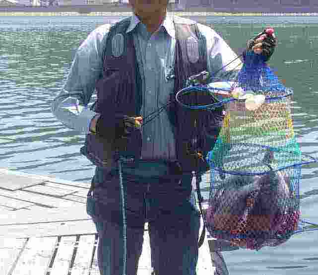 目の前で釣り人と同数程度の鯛がリリ−スされたのを見て一斉に竿が出されあちこちでタモに入れるのを見て”向こう側がよく釣れるな!!”の声を聞き、よし!釣ろう! エサをトマトに換え2匹連続ゲットし、その後生ミックを付けたが当たりなし。もう一度青物を狙おう!! 前回の仕掛けに持参の活きエサをしっかり生かしたまま投入! 活きエサが水中にもぐった瞬間浮きも消しこむ!一息間合いを取り大きく合わすと”ゴツン”と大物の当たり! 前回と同様のやり取りをするが型が少し小さいのか早く浮いてゲット! その後も挑戦するが魚信なしで納竿。 |