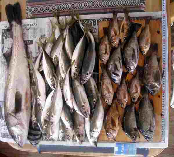 今日は同僚3名で遠出をする。 山陽道をひた走り目的地に到着して延べ竿を出す。 時間との勝負であると思っていたがリール竿も用意する。 それと言うのも体験上夕まずめを逃すとブツエビでは釣れないと思っていて 日が落ちると広範囲を虫餌で釣ることを念頭に入れている。 しかし、仕掛けを作っている間に他の二人は竿を既に出している。 撒き餌をするとアジが回ってきてアジの入れ食いになる。 自分も底撒きして上から撒いてみるが小さなめばるを数匹ゲットしただけで リール竿に交換する。 本来上撒きしただけで浮いてくるはずであったが棚は深くまばらだ。 皆こんなはずではない・・・・・・。 水温が急激に下がったためか? ????? ポイントは深い。 竿一本出すと2〜3ヒロある。 底を釣るように棚をあわして試すがバチメバルはパラパラとしかあがらない。 撒きすぎたのか大きなハネ(64センチ)がかかった。 休まず竿を振るがアジばかりだ。 大小あわせてメバル13・アジ48・ハネ1の釣果。 |