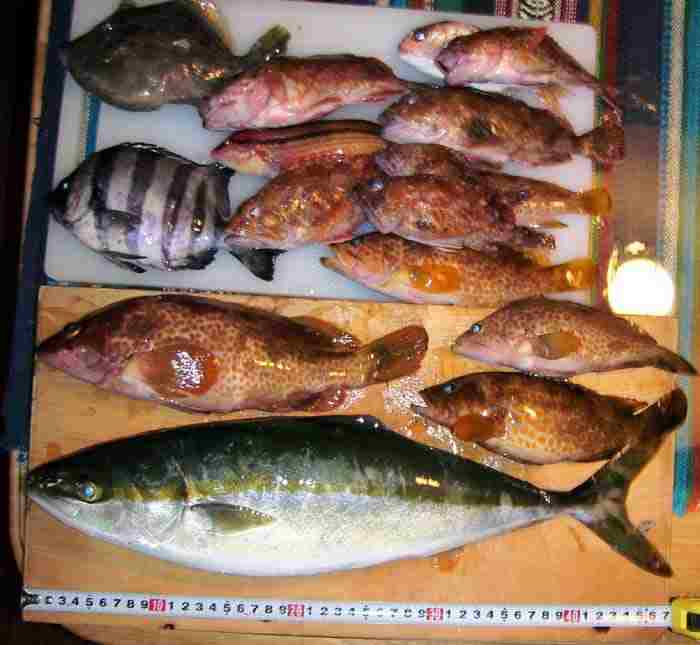 | 日本海 竹野 猫崎半島 大仏 アコウ釣り 2009年7月18日 曇り時々晴れ 波 穏やか 仕掛け:2号磯竿 2.5号道糸 ハリス:1.5号 リール:2500番 浮き:棒浮き1号 餌:エビ,青虫 今回は磯予約して大仏目指してアコウ釣りに出かけた。 事前に娘婿が船頭に釣果を聴取しアコウ・青物・アジ等の情報を得て万全の準備で 相生を3時AMに出発。 30センチオーバーを期待して竹野の渡船屋を目指す。 出港時間は6時AMだ! 目標時間前に到着して船頭の言葉「大仏は3Mを越す波のため乗れない!」 がっかりしたが相手は大自然船長の言葉とおり東側の磯に上げてもらった。 早朝の時間ルアー一本の彼は順調にガシラを上げている。 私は通常の棚取から始め虫餌でガシラを釣る。 でも芳しくなく餌取が多い。 予定とおりシラサの底まきでアコウをねらう。 娘婿は一匹既に上げている。 浮きは感度の良い2号から1号に変えている。 浮きが立つかたたないかで餌は無い。 しかし、餌取の引きでない当たりを感じる! 一度強い引きで根に入られハリス切れをしている。 小魚を数匹釣った頃突然のズボ引きで竿を立てると一瞬地球を釣った錯覚のあと ゴンゴンと短く竿に魚信が伝わる。 根に入られまいと強引に2号の竿を生かしてリールを巻き30センチ程度の アコウをゲット! その後、磯ベラ・河豚・スズメ鯛等の餌取に悩ませながら サンバソウ・カワハギをゲット。 餌取を釣りながら磯代わりの話をしていると彼の携帯に船長から 予定の大仏に乗れると連絡が入った。 すかさず返事をして棚が11Mから12Mのポイントに移動。 磯の目前2〜3Mから切り立っている。 棚を取りいつもの様に竿を出していると3〜4センチ位の小魚がセイゴかスズキに 追われていると誰にともなく話したその後彼が「ナブラや!」 「どこに!」のことばでトップゲームに変える。 彼は既に用意していた竿でナブラに挑戦して一投目から魚信を確信した。 三度目のキャスティングで彼はハマチをゲットした。 私もと思いきやナブラは過ぎた。 ナブラを待つ中シラサで根魚を狙うがナブラが気になってお互い釣りにならない。 何回かナブラにルアーを投入するが続けて3度ルアーを追う青物 の水流を見るが針掛かりしない。 5時30分をまわる頃目の前30Mと60M位にナブラが出る。 すかさず70M位キャスティングして引いてくる。 目の前20Mぐらいで魚信があり一呼吸置くとぐぐっとルアーを引き込む当たりに 竿をあおるとがっちり食い込みブリ用の竿一瞬のうちにごぼう抜きで ハマチをゲット! その後ナブラはみられなく虫餌でアコウを2匹追加して7時PMに納竿。 インターネットでトップゲームの予感を察知して竿を持参したのが釣果に連結。 次の釣り行脚の会話と快い疲れの中帰途につく。 |