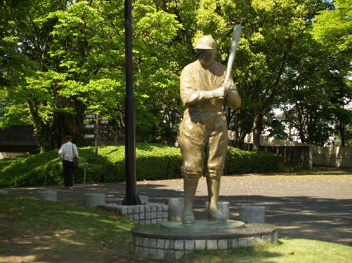 球場入口には、それを記念し沢村栄治とベーブルースの像が飾られている。