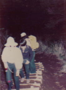 | 5月2日の夜から5月3日、自称YDC登山同好会(随時メンバー変更・自由入退会制)は丹沢山へ行ってきました。とても楽しかったので近況報告として、YDCの会報の一部を借りさせてい頂きます。5月2日、22時 小田急線中央乗車口に集まったのは5〜6名、もう少し待ってみましょう。と30分−。全員で15名。10時38分行動開始。さて渋沢駅に着き、少し待てば来るはずのバスが来ません。そこで駅員さんとひと悶着、その甲斐あってかバスが来たので約15分。バスを降り電灯を出し、山頂での水の必要性を予知し、そばにあった一升ビンをよく?洗い、水を入れ運ぶことにしたのですが、果たして誰が持つか、もちろん立候補者ゼロ、したがってザックの中に一升ビンがはいる位の余裕のある人へ全員の視線がジ〜、結局A氏に勇者になってもらう事になりました。当人曰く『一升ビンのある方に重心がよって一方の肩だけが凝る』そうです。0時50分、最初はアスファルトの道で、しばらく行ってもまだ人家が多くあり、いささか期待はずれ、やっと山道になり、ふり返ると星ひとつない夜の闇の中にポッカリと町の灯がみえる。それをバックにフラッシュ付のカメラで記念撮影。迷カメラマンのO氏『本当に焦点あってんのかなあ』と独り言をいいながらもパチリ、パチリ。まだ先は遠いのです。歩いて行くうちに年齢の差か先頭と回れ右して先頭の差が大きくなってくる。『おーい先頭』と後ろで声。電灯で照らすと、はるか向こうでやはり電灯が動いている。それならばと先頭は休みもかねて待つのです。後ろの人が追いついた時点で出発です。それではペースの遅い人はいつ休むのですか?ともかく、どこをどう歩いているのか、もやの中でやっと足元の小道が見えてきました。そういえばお腹も空いてきたみたいです。途中から降り出した雨に道はぬかるみ、あちらこちらで、キャードスン、アレーの声が飛び交う。女性にはよきナイトがついているはずなのに不思議ですね!また、斜面60度位の所を鎖につかまりながら登り、あとで上から見てドッキリしたり大変でした。ここでO氏のスタイルを見て頂きましょう。上下黒のカッパスーツ。実によく一見二枚目。ところが歩くとガニマタなので、ズボンの内側がよく見えるのです。ひざ上まで一面泥だらけです。よくまあ、あんなに、でもよくみたら皆同じ・・・と、まあ色々ありまして。山吹と桜に囲まれた道なき道を『こんなに疲れているのに。眠いのに。なぜ歩いているのカナー』と思いながらも1,567mの山頂に到着したのです。あ〜実感!髪もパサパサ、ジーパンはドロンコ。でもさわやかな顔顔顔。さあ×にしましょう。貴重であるはずの水が山小屋にあり、A氏がいささかふてくされぎみ。食後は長らく休んで雨の中を出発。『こんにちは』『こんにちは、気をつけて』の声。そして山の上での赤出汁味噌汁と、レモンティー。思いがけない暖かな飲み物に勇気づけられて、さあもうひとがんばり。寝不足でニキビが気になるけれど器用にも、バスの中で立ったまま眠れる位。疲れたけど、本当に来てよかった。と全員が思った事でしょう。(記入者不明) |