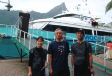 | 日付変更線を越えるため同日の早朝に到着。このため4日間の旅といえども2日間まるまるフリータイムです。タヒチは日曜日にほとんどの店が閉まるので、到着した土曜日に観光をしてしまおうと、パペーテのマルシュ等の店を見て、その後モーレア島に船で渡りました。モーレア島はタヒチ島のホテルから目の前に見えた興味あふれる島です。タヒチ島に良い砂浜は無いのですが、モーレア島には白いきれいな砂浜があるとのことでした。しかし、天候は残念なことに雨、少々寒くてドライブです。お昼はこの島では、いたる所にあるピザ屋に入って大きなピザを食べました。 |