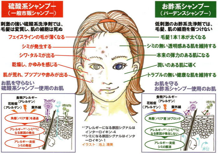 当店では、オーガニックはもちろんのこと、今までにない特許成分「お酢系洗浄剤(ラウレス3酢酸アミノ酸)」のシャンプーで界面活性剤で肌のバリア機能を破壊しない世界で唯一肌の(お肌のバリア機能を壊さない)シャンプーを使っています。市場に出回っているほとんどのシャンプーには硫酸系の洗浄剤が使用されています。汚れもよく落ちて、泡立ちもいい標準的な洗浄成分です。