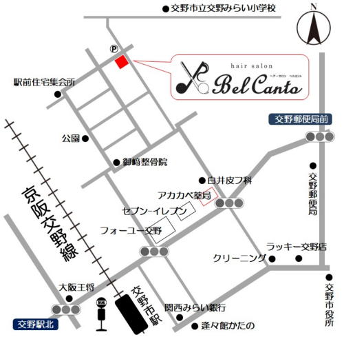 京阪交野線「交野市駅」下車後、改札を出て@番出口を交野市役所方面へお進み下さい。しばらく進みクリーニングのイセヅドライ私部西店を左折して、ドラッグストアアカカベ交野店の交差点をそのまま北西へ直進していただくとお店がございます。
