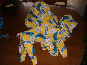 1.生地を裁つ 型紙に縫い代(2cm)は、含まれていません。 2.縫い代の始末をする。 3.肩上げ部分を縫い脇に倒す。(表から摘む) 4.袖を縫う。袖口は、三つ折り 5.両脇を縫う。(袖つけ止まりから裾まで) 6.裾の始末をする。(3つ折りに) 7.衿をつける。(角に切り込みを入れる) 8.衿をまつる。(3つ折りに) 9.袖をつける ※ 耳ぐけする時は、脇の縫い代を5cmにする。 袖口にかんぬき止めをしておくと丈夫。 前合わせにスナップをつけても良い。 |