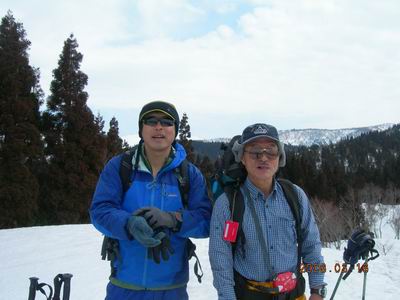 | それでも、コースを選べば快適に下れそうです。 階段登行よ、例の「ズリズリ」で登り斜面は対応します。 樹林帯は鬱陶しいですが、、傾斜も程ほどでなかなかスリリング。 「木に激突しないように、気を付けて滑りましょう!」 と言いながらも、OMさんも私も危ない場面があった。 国道からは2km程の歩きを余儀なくされるのだが、幸いにもヒッチハイクで事なきを得た。 「有難う御座いました」 |