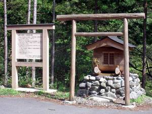 昨夜はN君が来たのも上の空で寝入ってしまった。 前夜が仕事だったので、かなり疲れていたのだろう。 勿論毎週末の山行も大いに影響があるだろうが、週末は気分転換して遊ばないと仕事が出来ない?! 朝食はカップ麺で効率的に済ませる。 駐車場の車も5台に増えている。 釣りらしいグループが到着したので、先を急ぐ。 立派な道に沿って川を遡るが、渓相は中々良さそうだ。 川上村が整備したと案内板に記されていた通りだ。 所々にヒノキの橋が掛かっている。 明神滝への分かれ道を過ぎ、大きなヒノキの木の所から川面に降りる。 此処から各々釣り出すが、最終的に釣果は私の20cmとA君の小さなもののみ。 余りの貧果に他の谷への転進も考慮したが、やはり「此処まで来て馬ノ鞍に登らない理は無いだろう」との筋論が大勢を占めた。 「よし!馬ノ鞍まで行くべし!」 と決定。 直ちに渓流釣りスタイルから登山装備に変更したのであった。(と言っても単に靴を履き替えたに過ぎない!) かなり急な斜面に付けられた道をぐんぐんと遡ると、沢の合流点の比較的平らな地点に辿り着いた。 ここが行宮址や墓所であり、歴史に感慨を抱きながら見て歩く。 それにしても本人の意思で隠れた訳でないので、「かくし平」とはうまく名づけたものだ。 |