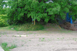 城の敷地は現在、畑になっている。向こうは、北西隅に残る土塁の一部。 現地案内板の、復元想像図