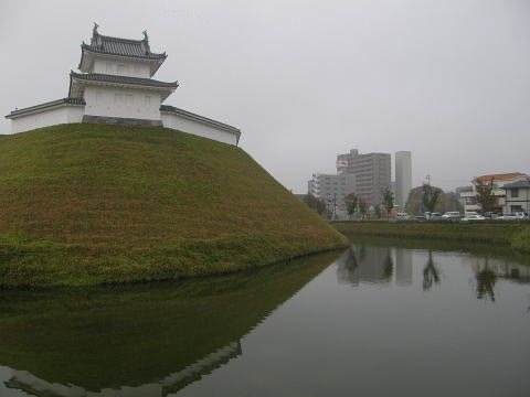 | 宇都宮城は、本多正純によって大きく改修されたものであり、本丸を二の丸で囲み、その北、西、南に曲輪が連なり、さらにその外側を曲輪が囲む、輪郭式と梯郭式を併用した縄張りであった。戊辰戦争に際して、大鳥圭介や土方歳三に率いられた幕府脱走軍に占領され、数日後には新政府軍に奪い返されるという争奪戦の場となり、城は炎上して破壊された。 現在、城の遺構は残っていないが、本丸の一部が宇都宮城址公園として整備されている。その西側に面して、水堀と土塁が復元され、土塁上に、清明台櫓と富士見櫓、及びこれらを繋ぐ土塀が復元されている。 |