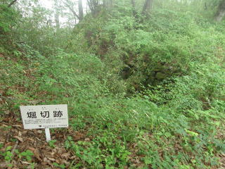 | 主郭の西側の堀切。石垣が用いられているのは珍しい。 | 現地案内板の復元推定図 |