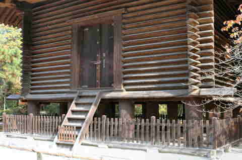 壁を形作る校木は、経蔵が17段であるのに対して、宝蔵は21段である。 校倉造はこの校木を井籠形に積み上げたものである。 |