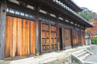 | 正面中央の三間は桟唐戸。 | 組物は禅宗様に特有の詰組となっている。また二手先が尾垂木となった二手先組である。 |