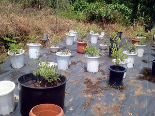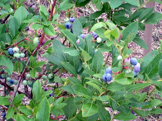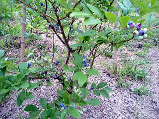 ブルーベリー6本がありますが、収穫 できるのは3本です、他はまだ色がき ていません。 |
