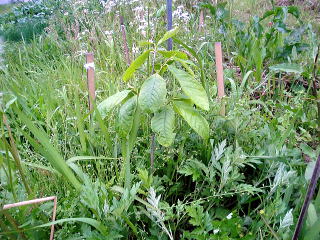 <ポポー> ポポーです、植え付けて2年目です。 実のるまで数年かかるそうです。 |