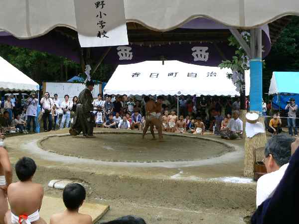 | 9月11日にお祭りがあった。上記写真はその時の様子である。伝統の神事「神相撲」に続いて大勢の力士によって取組が行われた。近隣の小学校7校による団体戦、中学、一般の部など。さらに豆横綱の土俵入り、三十数名におよぶ赤ちゃんの土俵入りもあり朝から午後4時ごろまで盛り上がっていた。参道を埋めた屋台にも大勢の人が楽しんでいた。夕方はコンサートがあり、ピアノ、お琴、太鼓の演奏があった。特に海外にも公演にでかけることがある大原野竹太鼓集団による演奏は迫力満点。最後は観衆も参加し打ち鳴らす盛り上がりようだった。 | ||