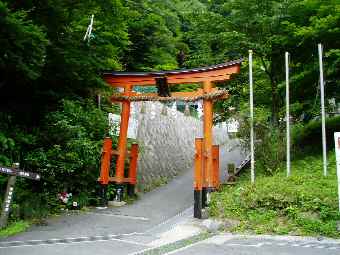 立派な社殿の江文神社で休憩する。しっかりしたトイレあり。社殿右側の山道を登っていく。ところがこの道は京都岳人のロッククライミングのメッカに通じていて山頂にいけない。一汗かいた所でクライマーに間違いを指摘され引返す。正しい道は社殿左側に入っていくのであった。すぐ写真右側のような立派に整備された金毘羅宮の参道でもある山道を行く。 | ![]() |