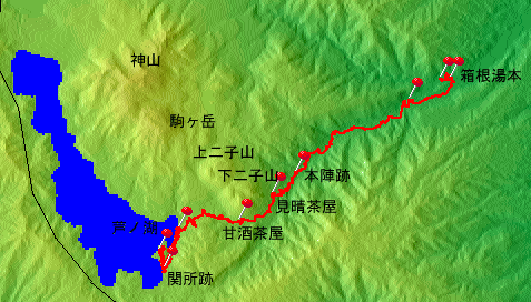 行く。国道を横切ると石畳の旧街道。昔から残るのは一部のみで大部分は近年整備されたもののようである。しばらくで本陣跡、畑宿に着く。いままでほとんど見かけなかったが畑宿にはハイカーのグループ。案内の表示板、トイレなどもあり、ここが旧街道ハイキングの発着点のようである。急登を行くと見晴茶屋。山間から小田原方面が見える。