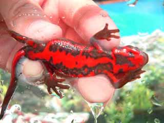 | 我が家に最初にやって来た、大将くんです。 どうです、この立派な腹!(笑) ご覧のとおり、オレンジ色の腹をしています。 背中側にも、赤い小さなスポットがテンテン と現れています。 出身地は、兵庫県市川・笠形の湖。 水深が相当深かったのですが、岸にひっつい ているのを、苦も無く捕まえました。 性格は、見た目によらず、とっても一途! 発情期には、メスにひたすら尽くしあげます。 |