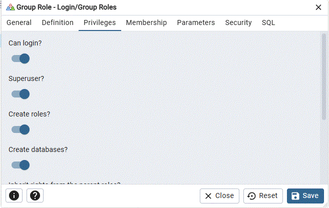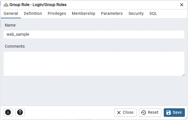 各データベースへのアクセス権限を制御するためです。 ・[PostgreSQL 17] をダブルクリック ・パスワードを求められたら、 postgres で、[パスワード保存] にチェック ・[Login/Group Roles] を右クリック。[Create...]、[Login/Group Roles...] ・「General」タブで、 Name:web_sample・「Definition」タブで、 Password:web_sample