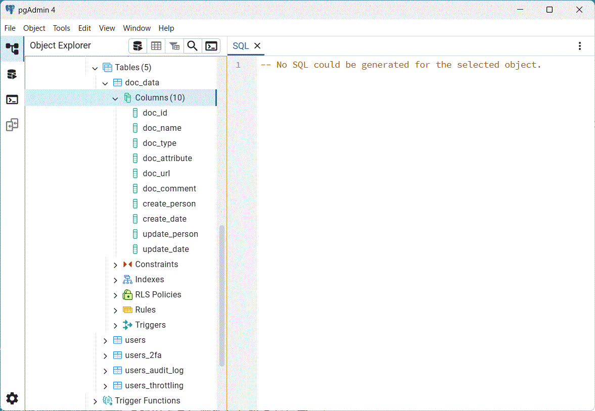 データの入れ物だけ作成しておきます。 引き続き、pgAdmin を使用します。 ・[Databases] を右クリック。[Create...]、[Database...] ・「General」タブで、 Database:doc_list Owner:web_sample・「Definition」タブで、 Encoding:UTF8 Template:template0 Collation:Japanese_Japan.932 Charactor Type:Japanese_Japan.932