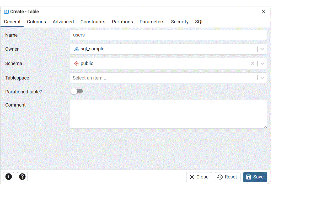[Databases]、[sql_sample]、[Schemas]、[public]、 [Tables] までたどり着いてください。 # スキーマ(Schemas)、public について。 # スキーマは、 # 1つのデータベース内に、テーブルの論理的なグループを作る仕組みです。 # 1つのスキーマの中では、 # 各テーブル名は、ユニークでなければなりませんが、 # スキーマが違えば、同じテーブル名を使っても構いません。 # スキーマを指定せずに作成されたテーブルは、 # [public] という名前のスキーマに属する事になります。 では、実際にテーブルを作成してみましょう。 ・[Tables] を右クリック ・[Create]、[Table...] ・「General」タブで、 Name:users Owner:sql_sample・[Save] これで、テーブル users ができました。 次項で、列を作成します。