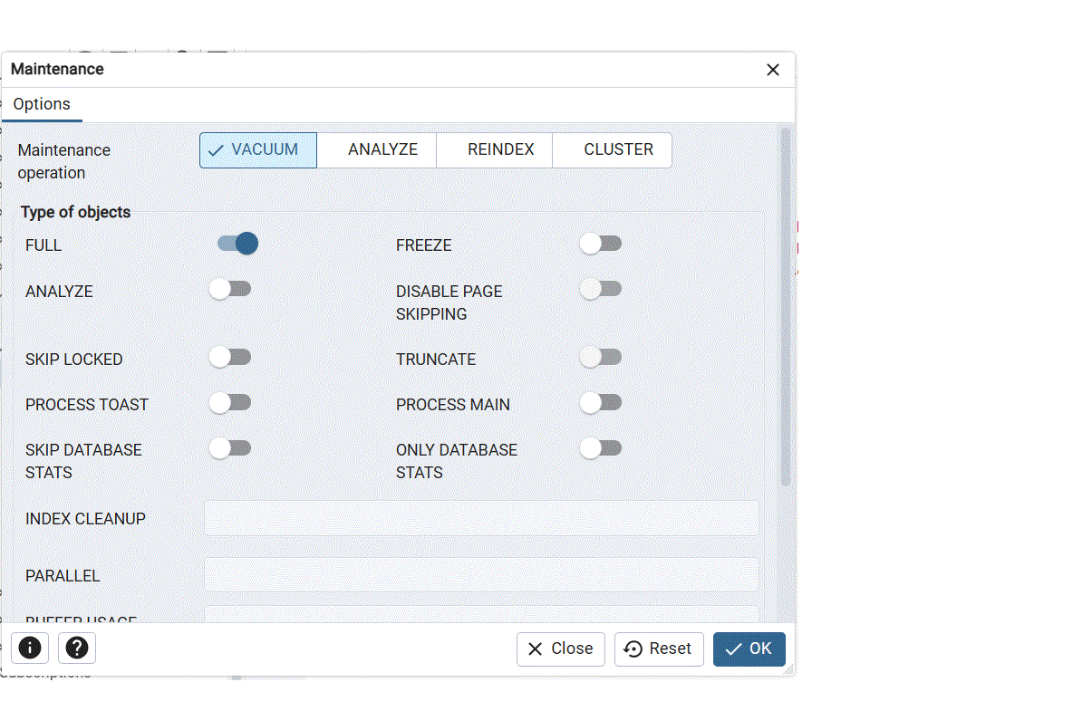 Type of objects で設定した FULL を使うと、 より高度な整理ができますが、実行中にテーブルをロックする点に注意が必要です。 ロックされたテーブルは他からアクセスできないので、 データベースの実稼働中に VACUUM FULL をしてしまうと、 システム全体に大きな影響を与える可能性があります。