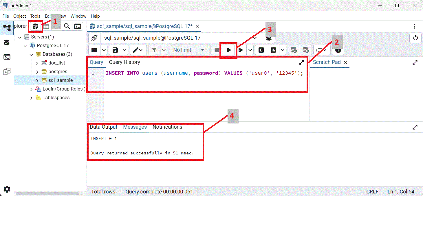 [Databases]、[sql_sample] まで行きます。 # これで操作対象のデータベースを指定したことになります。 ①. ツールバーの [Query Tool] ボタンを押します。 ②. [Query] 欄に SQL 文を書いて、 ③. [Execute script] ボタンを押すと、 ➃. 結果が、[Data Output] または [Messages] に表示されます。![]()
