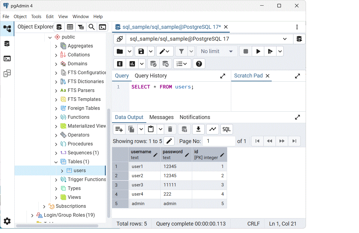 データベースのデータを取得できます。 INSERT のときは、PgAdmin で見ましたが、 SELECT FROM を使えば、 プログラムで取得できます。 書式:SELECT 列名1, 列名2 ... FROM テーブル名; 全ての列を選択する場合は、SELECT * FROM テーブル名;データベース sql_sample の users テーブルの 内容を全て取得するなら、 SELECT * FROM users; です。![]()