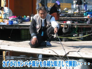 | 毎年1月2日は恒例の初釣り。今年の運勢を占うべく釣行がこのような結果になろうとは・・・^^; まあ、ぼやいても仕方がないので釣行記でも書くことにしよう。 雪が降ると親父は仕事のため釣行できないのだが、暖かい正月になってくれたお陰で今年は一緒に釣行することができた。メンバーは私と親父、叔父、そしてWさん親子とすーさんのお師匠である浜ちゃんの計7名。3時前に自宅を出て空を見上げると、風もなく満天の星空。これで釣果が良ければ言うことないのだが・・・ 道中はいつものように土山町から国道1号線へ、そして関から伊勢自動車道を走る。お伊勢参りの初詣渋滞もこの時間は皆無でいつも通りの時間で玉城ICへ到着した。旭家へ寄って活きマイワシ、石ゴカイを調達する。自宅からは前回の残りの生ミック、養殖団子、オキアミ、カボチャ団子、秋刀魚の切り身、着色甘エビを持参した。魚かしに寄って、アミエビバージョン(?)とシラサエビ、金魚を調達して迫間浦へ向かう。 5時半ごろに到着し、駐車場で準備をしていると浜ちゃんとWさんも登場されて新年の挨拶をして受付を済ませる。桟橋では君おじさんの指示で船に乗る。私たちは9番筏とのこと・・・7番と8番の間にある8角形の筏である。8角形の筏は個人的にはあまり好きではないが、この筏は一昨年の初釣りの時に乗って以来で、この時はまずまずの釣果だったので期待が膨らむ。 私たち7人と単独釣行の方の計8人を筏に上げていただく。南側に私と親父と叔父が釣り座を構える。しかし、生簀の中を見ると網がぐちゃぐちゃになって吹け上がっている。うーん・・・これは根掛かりが連発するのは必至である。まずは青物用タックルをセットして、秋刀魚で第1投するが穂先にラインが絡んでしまい、これを直そうと少し手繰り寄せるといきなり網に引っ掛かってしまった(>_<) 幸い、竿を何回かしゃくると外れたが出鼻くじかれた気分である。再度、秋刀魚を投入するが青物は正月休みのようなので鯛狙いに切り替えたいが・・・網のふけ上がりがひどく、ミャク釣りで鯛狙いをする人間には非常に辛い状況である。3mの青波巧ヘチ改を出そうかと思ったが、この竿はいまいちバランスが悪くバラシが多くなるので、あえて桜の西海2.4mをチョイスした。しかし、私の真下にはとても降ろせない。仕掛けの降ろせそうな場所を探し、親父の左側が比較的ふけ上がりが緩いので、場所を変わってもらう。タックルの準備をしている間にWさんがシマアジをGETされた。羨ましい限りだ。生ミックやカボチャ団子で8mぐらいを探るがなかなか当たりが出ない。そのうち浮き釣りでど真ん中を攻めている親父が真鯛をGETした。その間、Wさん親子が調子よく真鯛を上げていく。私も8時前になってようやく着色甘エビで真鯛をGETした。続いて、親父の甘エビにカンパチがヒット。今回は朝から先行されっぱなしだ。まあ、たまには親父に華持たせてやるのもいいか・・・と自分に言い聞かせる^^; 朝の時合いは短く、筏の上はすぐに静けさが戻ってしまった。こういう時はシラサエビでじっくり攻めることにする。仕掛けを中層まで降ろし、底付近までをゆっくり丹念に探ると棚7mでモゾーっと穂先に反応が出る。送り込んでアワセを入れるとイサキが上がった。これはチビシラサの2匹掛けだ。再度、シラサエビで同じ棚を攻めるが反応はない。通常、イサキは浅い棚で連続ヒットすることが多いが、今日は棚も深くて連続ヒットはない。今日の潮は澄んでいて、かなり下まで見えるので、これが影響しているのかも知れない。 8時半頃、本日一回目の放流船がやってきた。真鯛とシマアジが放り込まれる。とりあえず真鯛用タックルで穂先に神経を集中するが、放流の効果はあまりないようだ。君おじさんによると、鯛は生ミックへの反応が比較的いいらしい。養殖ではイワシのミンチを主成分としたペレットを餌に使っているが、イワシ団子や養殖団子はいまいち食わないとのことだった。時折、青物の様子も伺ってみるが、底で眠っているようだ。 悪戦苦闘しているうちに、10時半ごろに2回目の放流を迎えてしまった。カンパチやブリなど、青物が中心である。活きアジで棚8mにセットして、じっと浮きを見つめる。しばらく誰にもアタリがなかったが、ミャク釣りで青物狙いをしている親父の竿先がせわしなく動き始めた。見ているとゆっくり竿先が海中に入り、アワセが入る。ヒットしたが、ずいぶん重たそうである。しばらくすると魚体が見えてくるが、ここでリールのトラブル発生。巻き上げ不可能となったのでリールの上辺りでラインを手で引っ張り、竿の弾力を利用して何とかランディング成功^^; 水中ではヒラマサかと思ったが、念願のブリだ。私は青物をあきらめ、早々と鯛狙いに切り替える。生ミックを中心に、甘エビ、シラサ・・・と目先を変えるが反応は遠い。他の筏は結構釣れているように見えるのに、何故こんなに食わないのか?昨年夏のBBQ