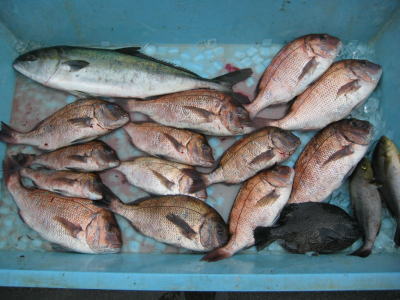 | 先月の大スランプの仇を討とうと、単独での隠密釣行を企んでいたが、台風16号が過ぎ去った今がチャンスと、この9/4に傳八屋にエントリーした。 当日は午前2時30分に出発した。天気予報を見たところによると雨が心配されたが、空を見る限りでは大丈夫そうだ。いつも通り、土山へ抜けて国道1号線から伊勢自動車道を走り、玉城ICで降りる。IC近くのえさきちや旭家を見るといつになく空いている。どこの餌屋さんへ行こうかと迷っていたが、久しぶりに松本へ寄ってみた。生ミック、オキアミ、冷凍キビナゴ、マムシが売り切れていたので石ゴカイ、シラサエビを仕入れた。そして自宅からは着色アマエビを持参し、傳八屋で活きアジを購入した。 5時半過ぎに傳八屋に到着すると、キセイさんに声をかけられた。途中のコンビニでも顔を見た覚えがあるのだが、何年も会ってなかったのでそのときは誰かわからなかった(^_^;) 傳八屋の駐車場で挨拶と雑談をしてから事務所で受付を・・・そして大将やおばあちゃんとも、しばし雑談。今日のお客は約40人ということだが、土曜日にこんなに空いているのは初めてのことだ(^_^;) 6時半頃に出船し、6番筏に上げていただいた。キセイさんらお二人も一緒で総勢7名でかなりゆったりだ♪すぐに青物用タックルをセットし、キビナゴを付けて8mに落とし込む。すぐにモゾモゾとしたアタリが出るが見事に空振りして、スタッフの弘矢君にも笑われてしまった(^_^;) 再度同じ棚へキビナゴを・・・またすぐにアタリが出るので、じっくりタイミングを見計らってアワセを入れると、今度は針掛かりした。手ごたえですぐに真鯛とわかったが、とりあえず一発目なので慎重に取り込んだ。周りがほとんど当たっていないので、連続ヒットは期待していなかったが、やはりアタリがない。この間に鯛狙い用のサクラ西海8号も用意し、まずは8m前後を中心に探ってみた。シラサエビで誘いを入れながら広範囲を探っていると、真鯛がヒット。朝一番や放流直後に威力を発揮する着色アマエビでまずは探ってみる。網際がかなり吹けているので、ラインを潮に同調させながら7.5mくらいを丁寧に探る・・・しかし、アタリは遠い。シラサエビに交換して同様に探るとようやく小さなアタリが出て真鯛がヒットした。しかし、連続したアタリはなく活性は低いようだ。今日も厳しい戦いになりそうだが、とにかく前回、前々回の結果のことが頭にあるので、何としても頑張らねば・・・(^_^;) 網際では根掛かりが多くなってきたが、網際スレスレ狙いで餌のローテーションを怠らないように心がけながら釣ることにした。必死の打ち返しも空しくアタリは遠いが、何とかオキアミでイサキを、シラサエビで真鯛を追加した。この6番筏だけでなく、この日使用されていた1、2、5番の筏もかなり活性が低いようであまり歓声が聞こえてこない。 8時過ぎに放流船がやってきた。大量の真鯛やシマアジと一緒にカンパチも2本ほど放流された。タックルは西海のままで真鯛・シマアジ狙いでいくことに・・・しかし、誰にもアタリが出ない状況がしばらく続いた。めげずに餌をローテーションさせながら浅めの棚をさぐってみると、棚6mでオキアミに真鯛がヒットした。同様にオキアミで探ると単発ではあるが、真鯛が何匹か上がった。 10時過ぎに2回目の放流船がやってきた。隣の5番筏への放流中に、アジを泳がせていたキセイさんにカンパチがヒット。右隣の2人とオマツリしながらも無事にGETされた。その後、船がやってきて青物を中心に大量に放流された。青物タックルに持ち替え、活きアジを棚8mに泳がせてアタリを待つ・・・そのうち、キセイさんのお連れさんにワラサがヒット。私はしばらく待てどもアタリがないので、ゆっくりと巻き上げながら誘いをかけてみることにした。1mほど巻き上げた所でゴツゴツとした手ごたえがあり、そこで止めて待っているとひったくるようなアタリが出たのですかさずアワセを入れた。2、3回ラインを引っ張り出されるが慎重にやり取りしてヒラマサをGET。さらに青物を追加しようと頑張るが、アタリがないので見切りを付けて真鯛狙いに変更した。こちらもしばらくはアタリがなかったが、着色アマエビでコーナーぎりぎりを狙っているとイサキがヒットした。イサキは連続ヒットする確立が高いので、ここを集中攻撃するがイサキはヒットせず、真鯛が立て続けに上がった。その後はシラサエビとオキアミをメインに、誘いまくって単発ではあるが真鯛の数を伸ばす。お昼前にはシラサエビで石垣鯛がヒットした。棚は6.5mと少し浅めだった。その直後にキセイさんのお連れさんにも石垣鯛がヒット。群れている可能性が高いので、シラサエビや石ゴカイで同じ棚を徹底的に狙うもヒットしなかった。 最終的な釣果は真鯛13、イサキ2、石垣鯛1、ヒラマサ1。潮はまだ酸欠状態で、アタリも少ないがめげずに最後まで集中できて良かった。「攻め」の釣りを意識して望めば勝