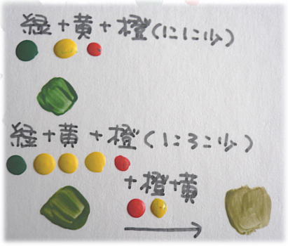 緑系の色として使う場合、赤を少量ずつ混ぜてみてください