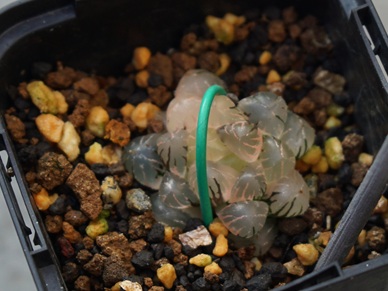 また、小苗や挿し木苗は新根の力で株を押し上げてくるので、曲げたアルミ線などを両側に突き刺して固定しておきます。写真上右
