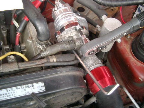 | 純正配管を外した後に付属のゴムナットをはめて付属の ロックで締め上げます。 (これを閉めるのにバッテリーが邪魔になるのです) |