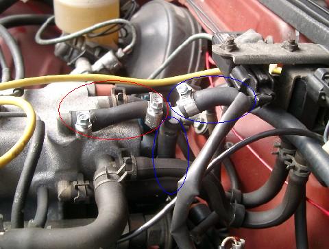 | インジェクターから出ている写真の配管を分岐します。 赤○が純正配管でカットしまして3方ジョイント(付属)を 解して青○(付属のチューブ)のように分岐します |