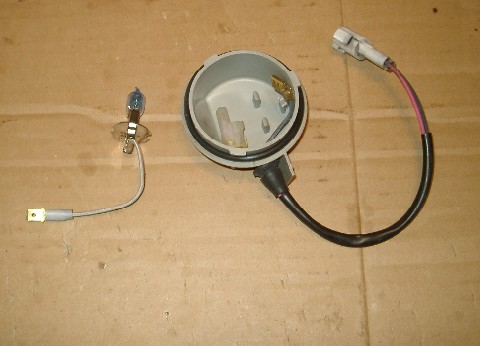 | ジャッキアップしてバンパー下のボルト、インナーフェンダーの プラスネジ1個とプラピン2個外します 純正のバルブASSYを丸ごと取り去ります。 このASSYのキャップと防水ゴム、コネクター1個は流用します。 |
