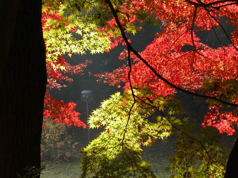 赤と黄色のコントラストが美しい。手前の大きな大木の黒が、