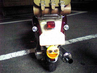 | オークションでゲットした80年代(?)パーツのスマイリーブレーキランプを取り付けました。 | このように光ります。 | カッティングシートでSP忠男の目玉マーク女の子バージョン(まつげがある)作りました。 |