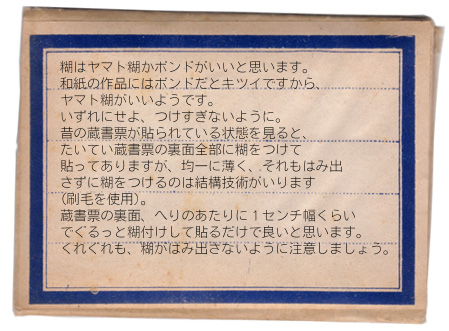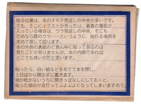 「蔵書票の貼り方」 田中栞さま(no.46)より教えていただきました。ありがとうございました。 (貼り方に「こうしなければいけない!」といったような決まりは無いです 下のものは、あくまでも田中栞さまの貼り方という事です 参考にして、どしどし貼ってくださいまし!)