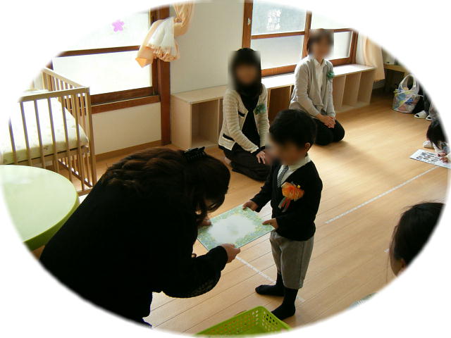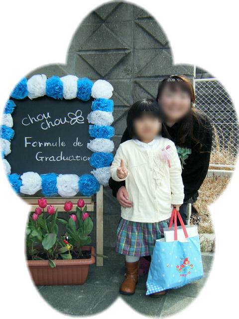 3月末(該当年度のみ実施)に行っておりますので、この日ばかりはお仕事などでお忙しい親御様方も、日程をやりくりしてお越し頂けましたら。。。この一年、chouchouで学んで頂いた、生活発表も兼ねた立派な立ち居振る舞いと、園長から、卒園証書代わりの色紙を受け取る凛々しい姿をご覧頂き、Staff一同新しい門出の日を、祝わせて頂く時でございます。できましたらハンカチをご用意の上、ご参列ください♪