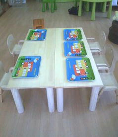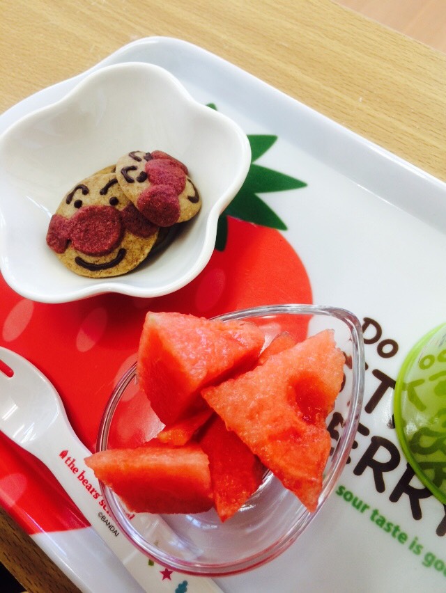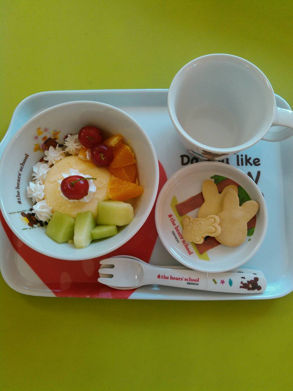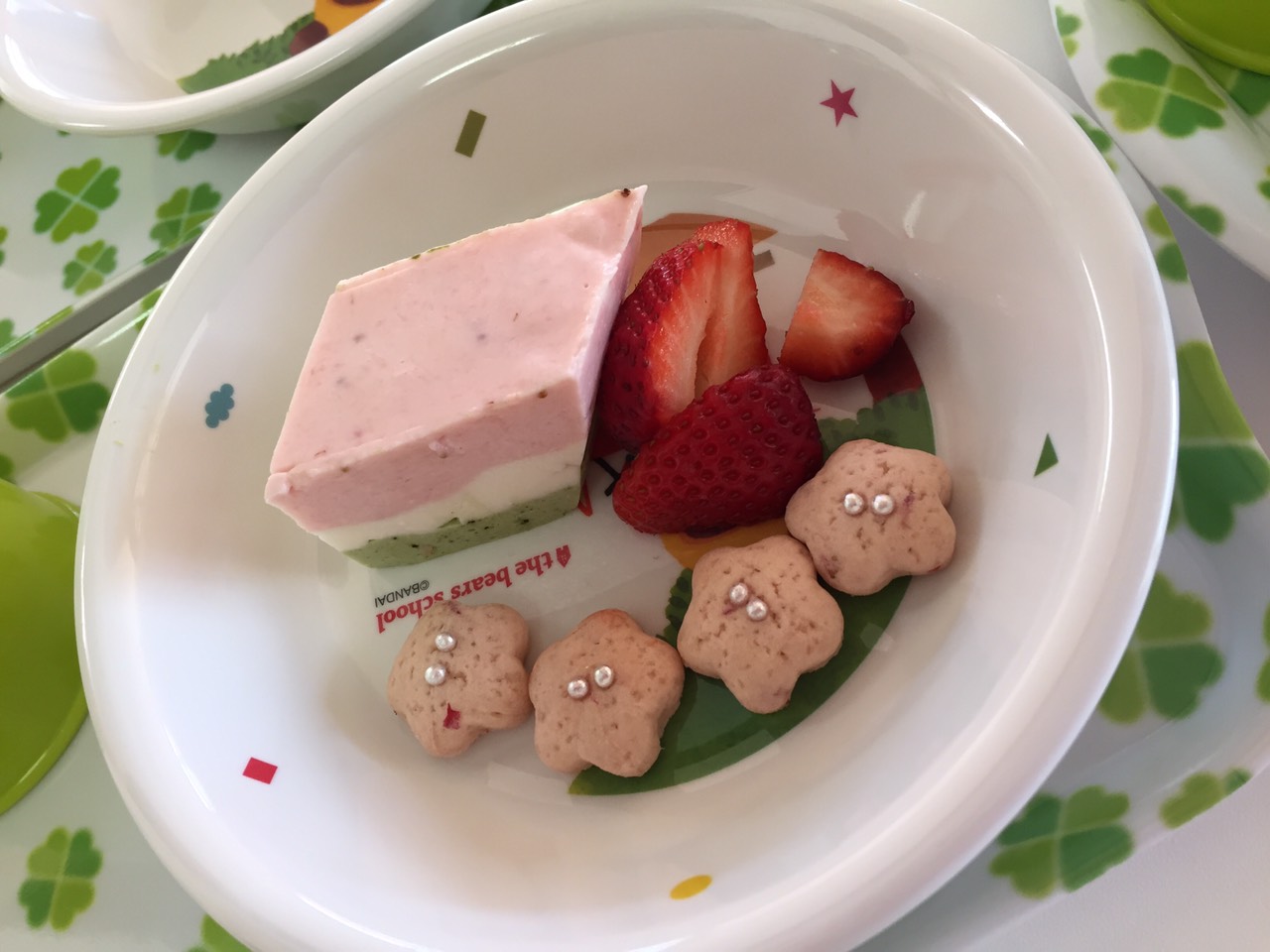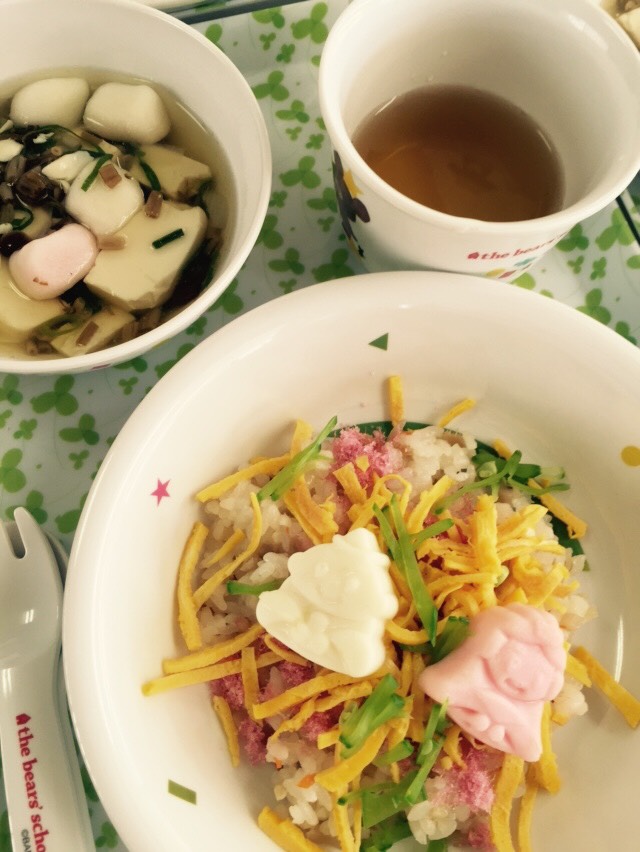 保育ルームchouchouでのお給食についてご紹介♪2015年度から、西宮市認可施設に移行した年より、前年度まで希望の方にのみお手配しておりましたお給食でしたが、2015年度より通常給食実施となりました。 上部のテーブルに、5人のKidsちゃんそろってお食事☆食器は、くまの学校デザイン。お給食は、地産地消をモットーに、化学調味料を使用せず、食材本来の味を感じて頂けることを心掛けております。おやつも、果物を多用し、楽しみと栄養のバランスをとっております。また、最下部のような行事食(お雛祭り仕様のチラシと菱餅チックな3色ムースのおやつ)も取り入れております | ||